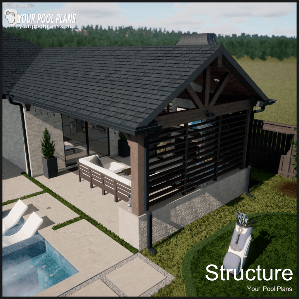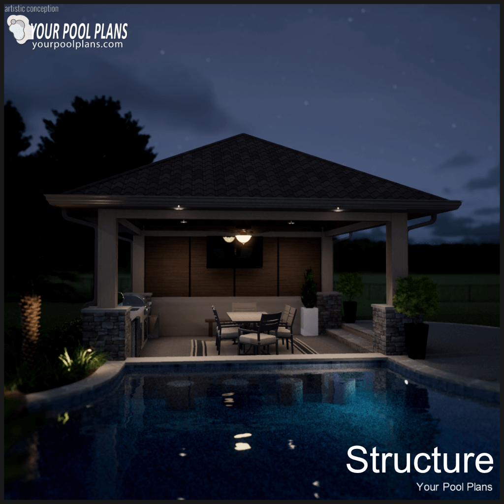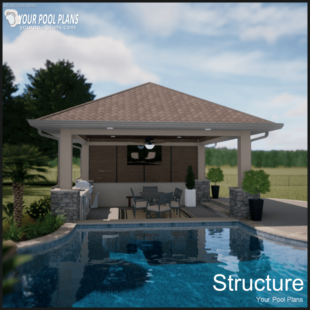 Conceptual outdoor living structure design that can be added to a preliminary pool design layout. Kitchen is not included.