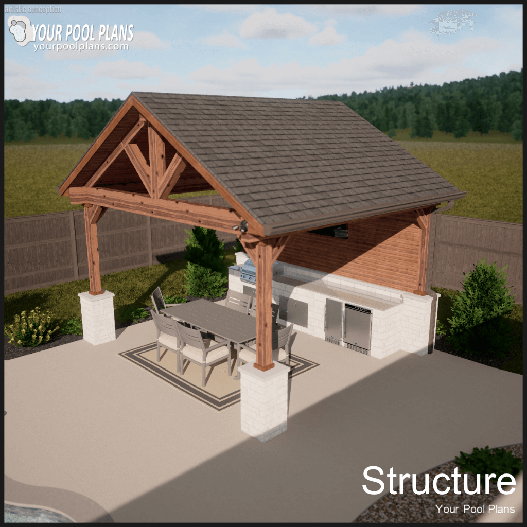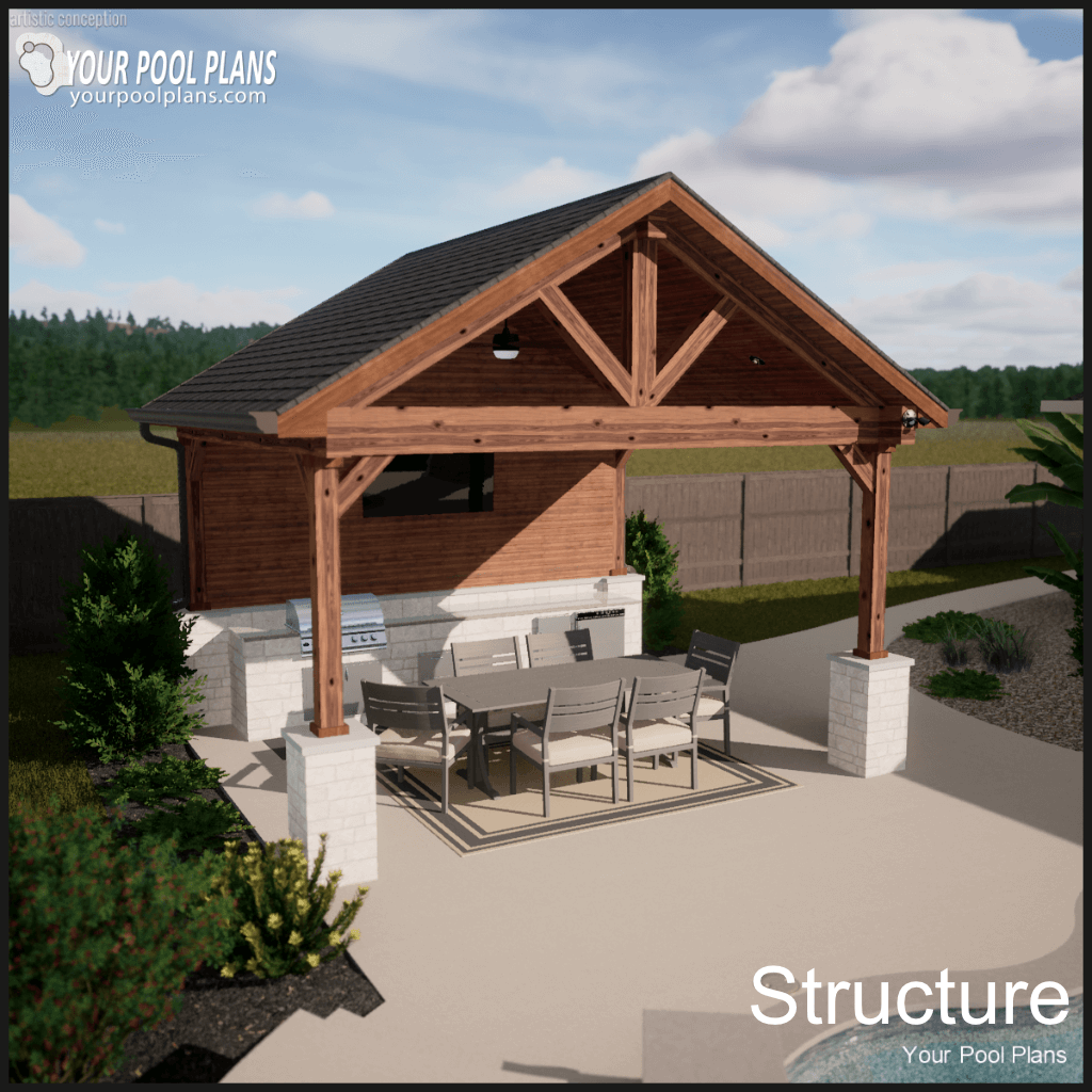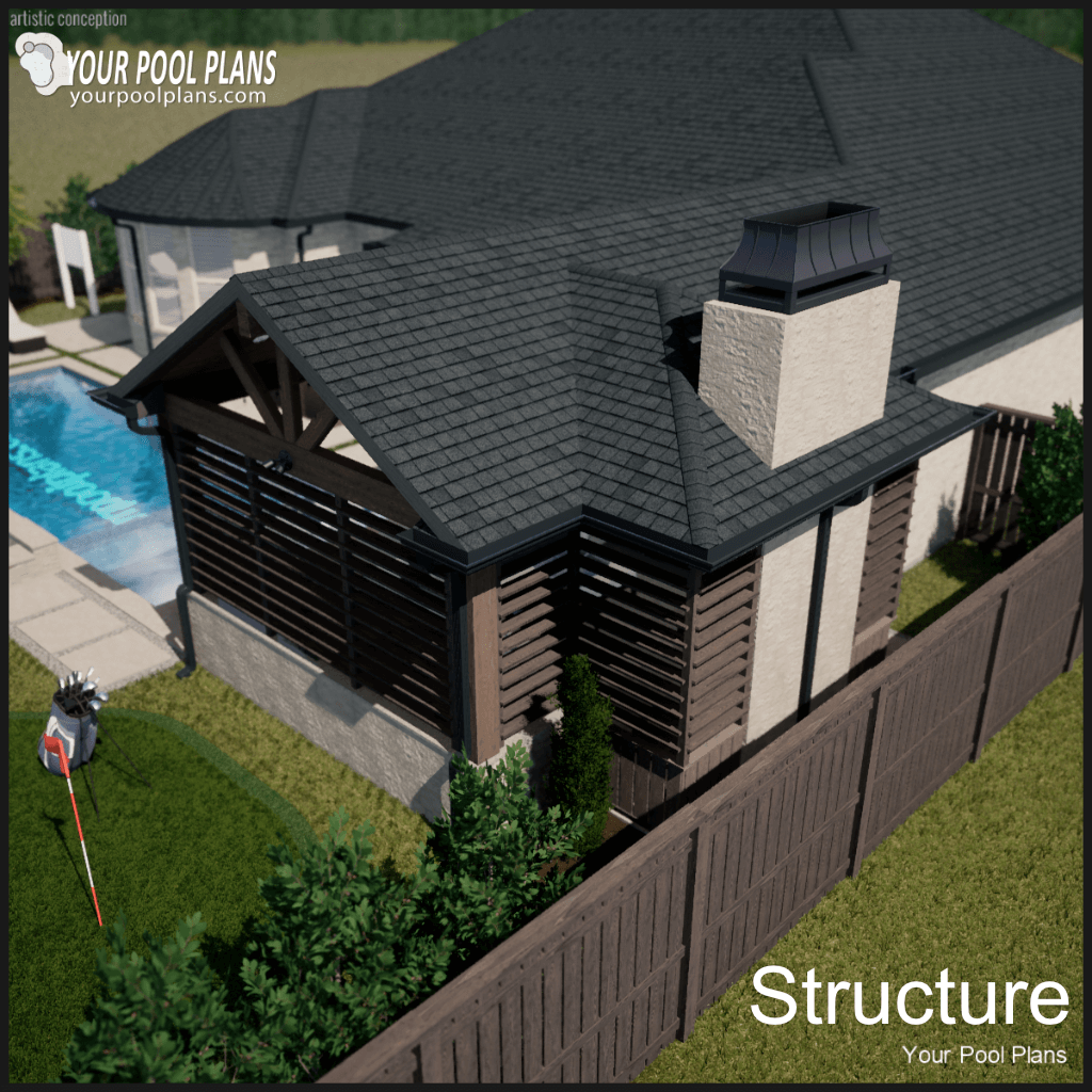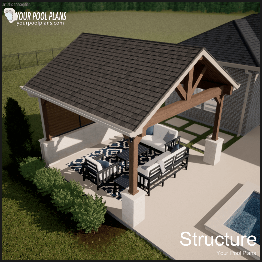Conceptual outdoor living structure design that can be added to a preliminary pool design layout. Kitchen is not included.